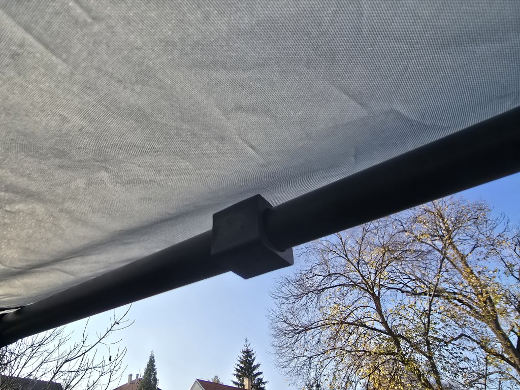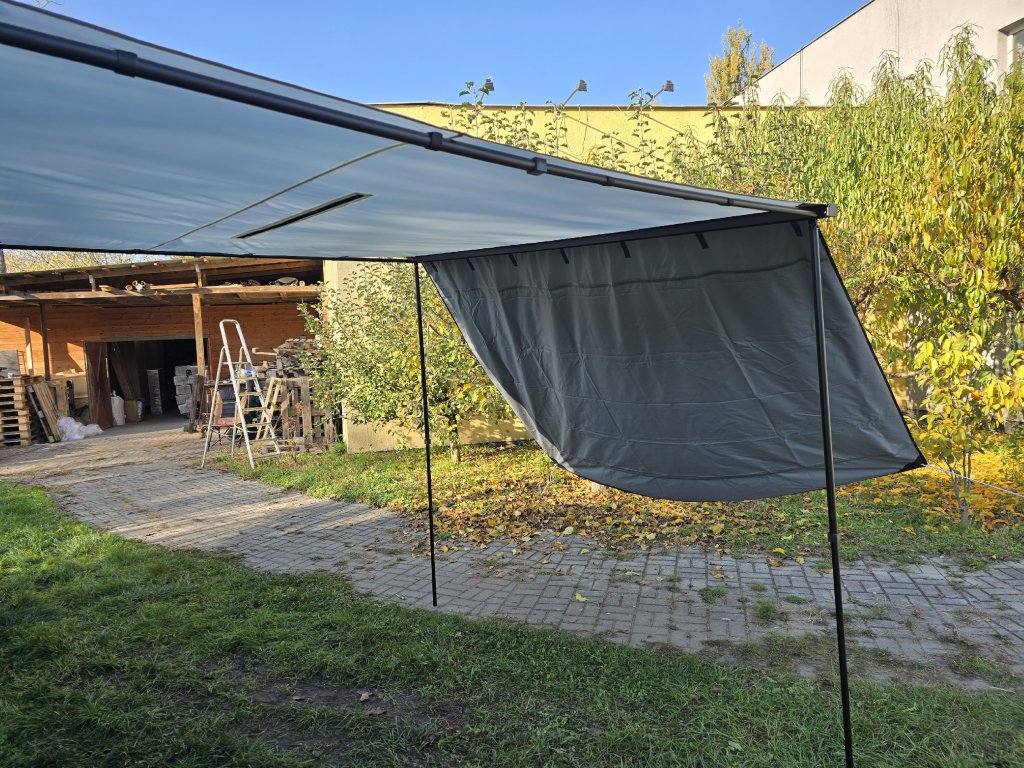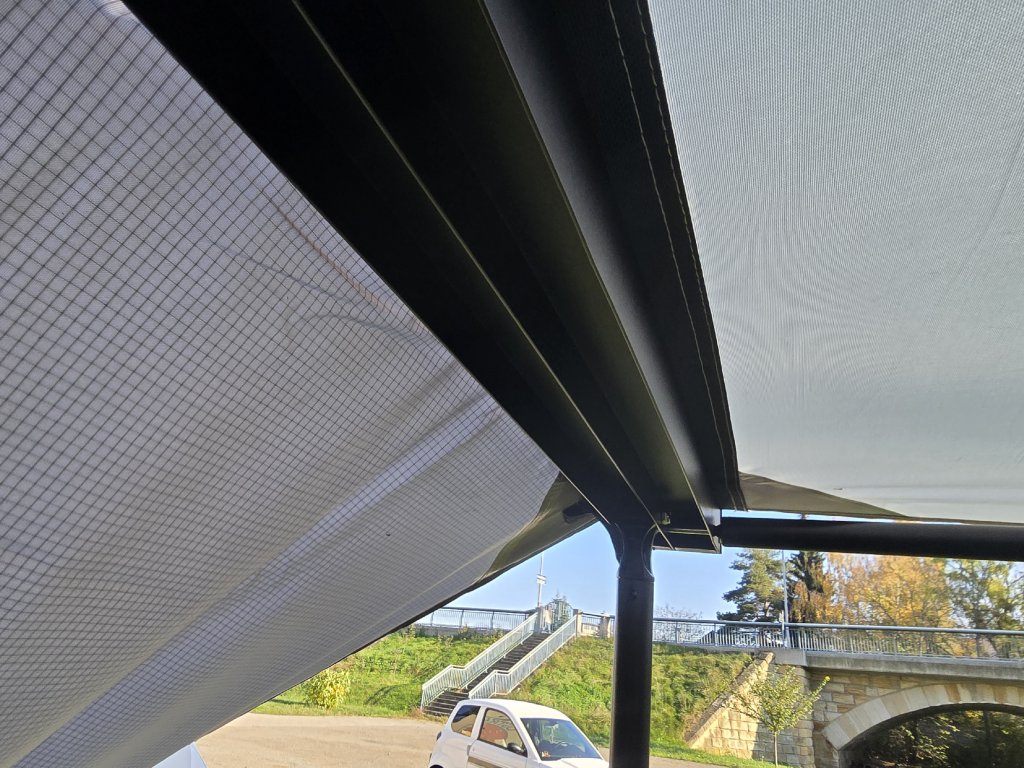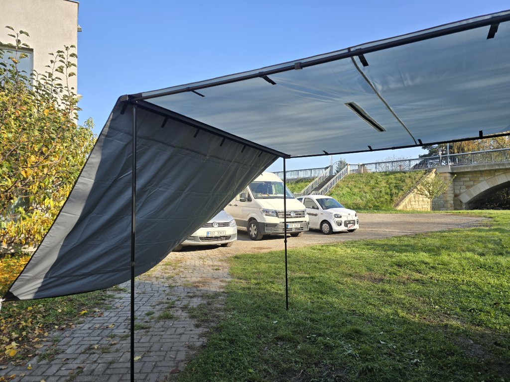Robustná hliníková konštrukcia a nepremokavá plachta s vodným stĺpcom 8000 mm zabezpečujú spoľahlivú ochranu pred dažďom. Špeciálna úprava plachty poskytuje ochranu pred UV žiarením. Suchý zips uprostred plachty umožňuje jednoduché uchytenie LED pásika.