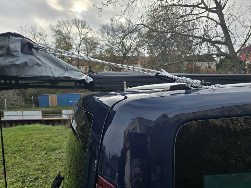 Markízu možno pripevniť na akékoľvek vozidlo so strešnými priečnikmi – pomocou T-skrutiek alebo plochej ocele. V balení nájdete L-držiak, T-skrutky, kolíky aj laná na upevnenie k zemi.