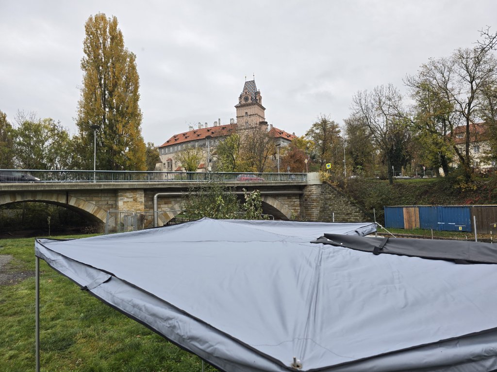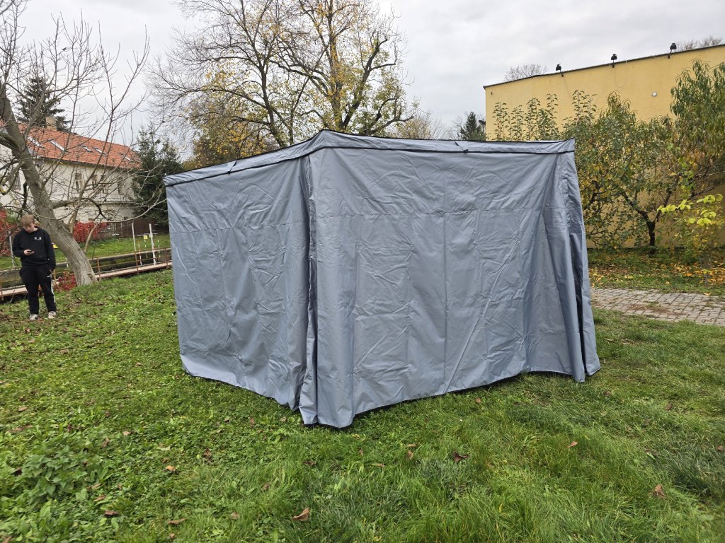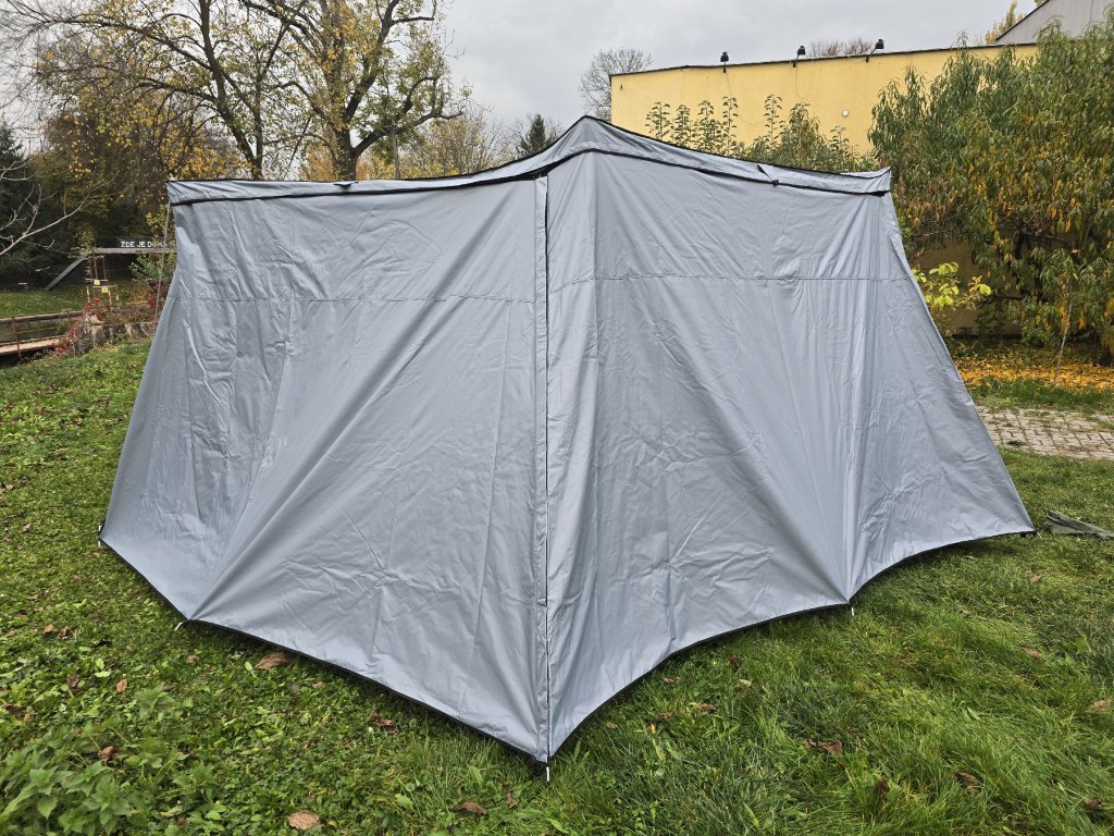 Súčasťou balenia je L-držiak, T-skrutky, kolíky aj laná na upevnenie markízy k zemi. Bočnicu je možné dokúpiť samostatne.